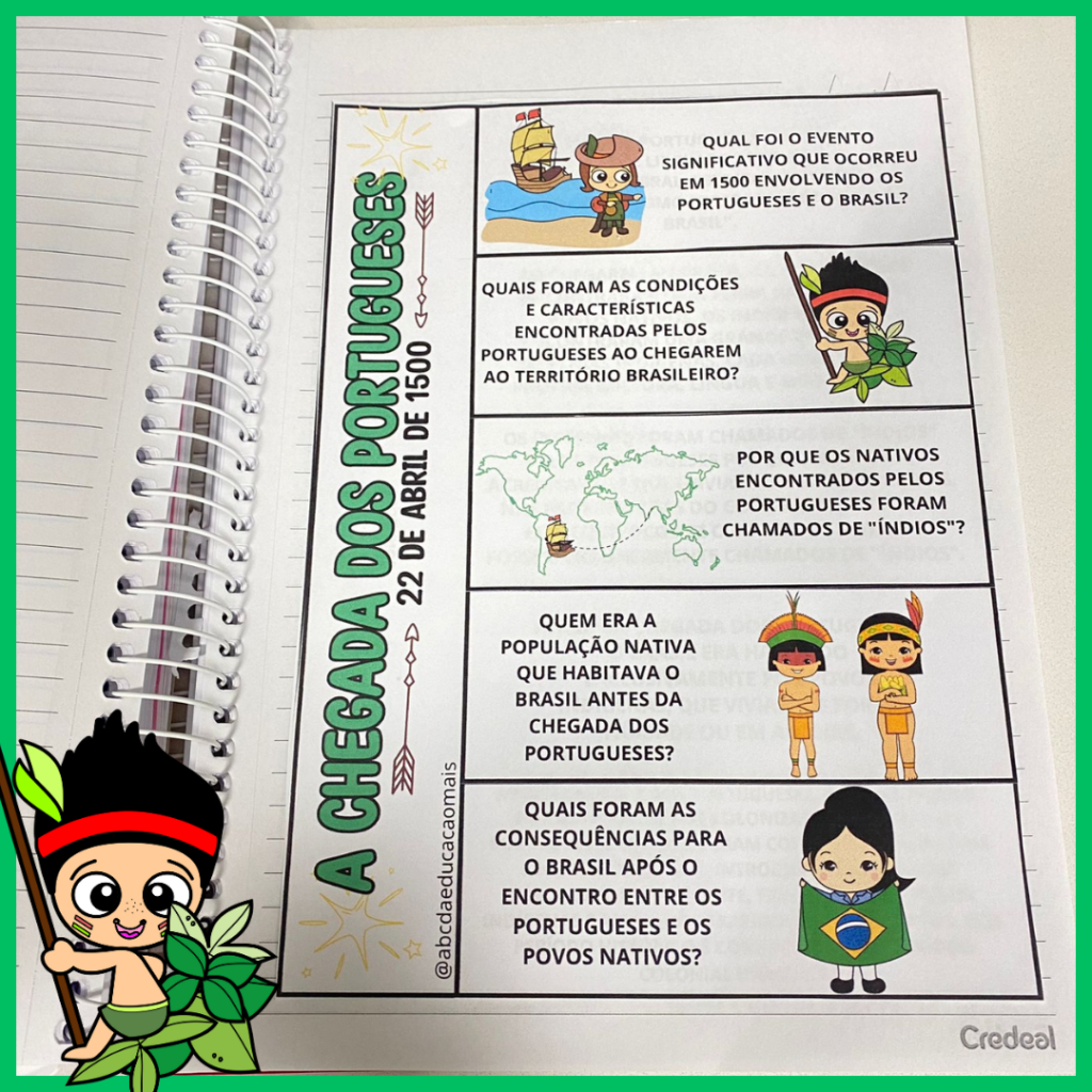 Para explorar os diferentes pontos de vista e impactos da chegada dos portugueses, atividades que abordem a vida dos indígenas antes e depois da colonização podem ser incluídas. Elaboração de diários fictícios a partir da perspectiva indígena ou o desenho de cenas que contrastam as diferentes formas de vida podem ser algumas sugestões.